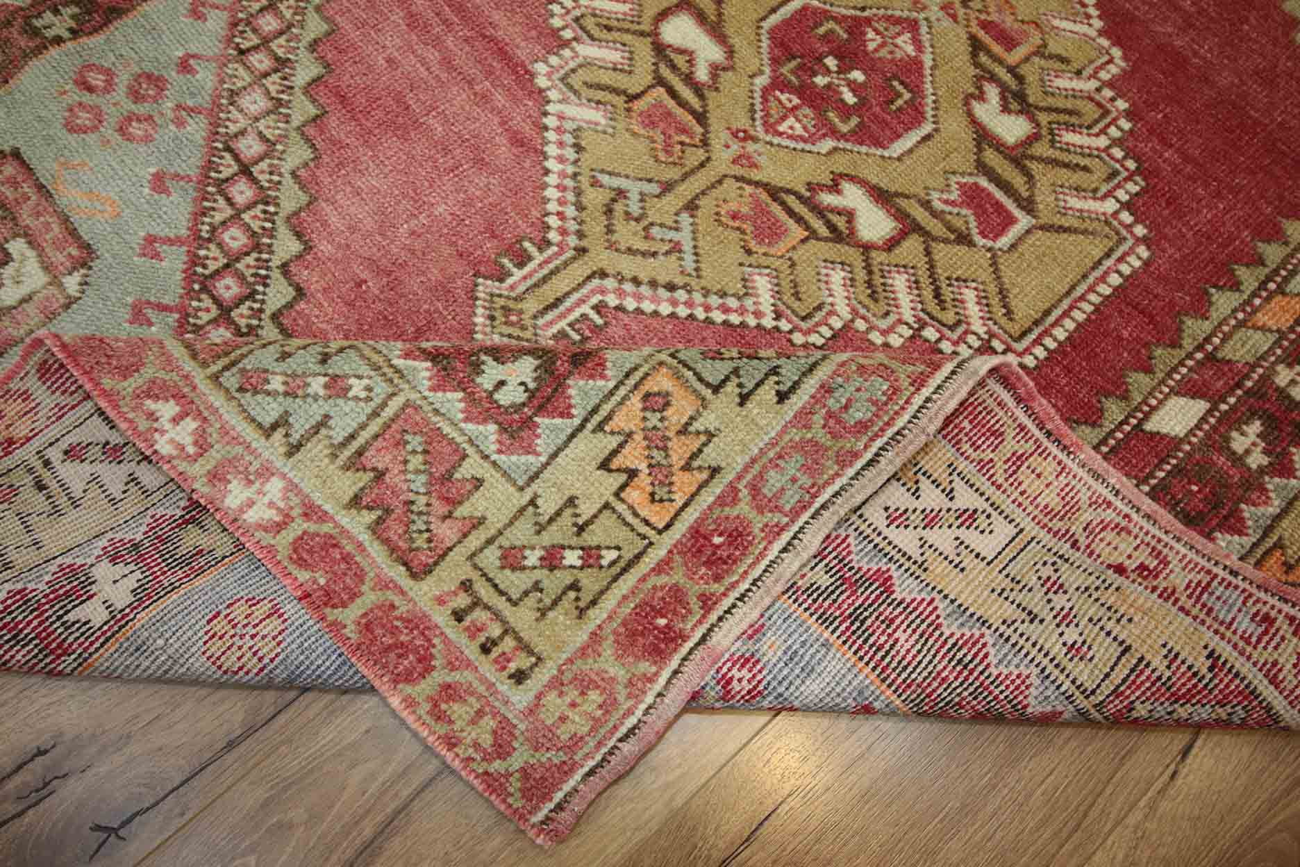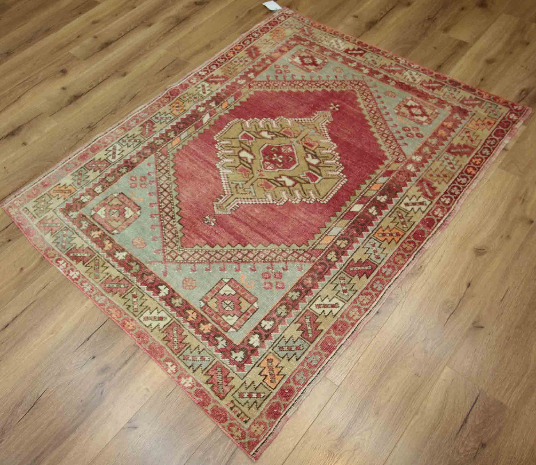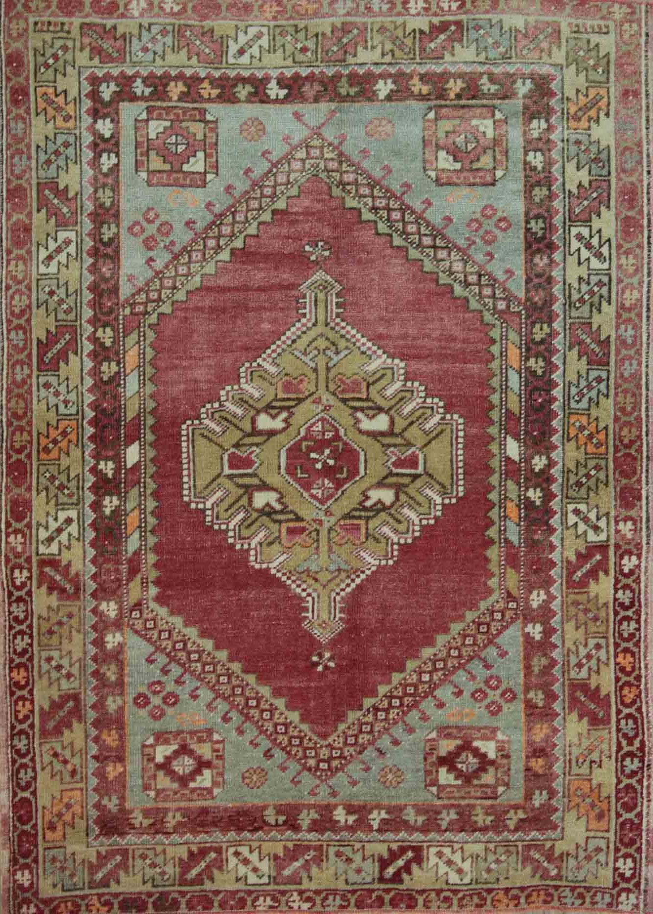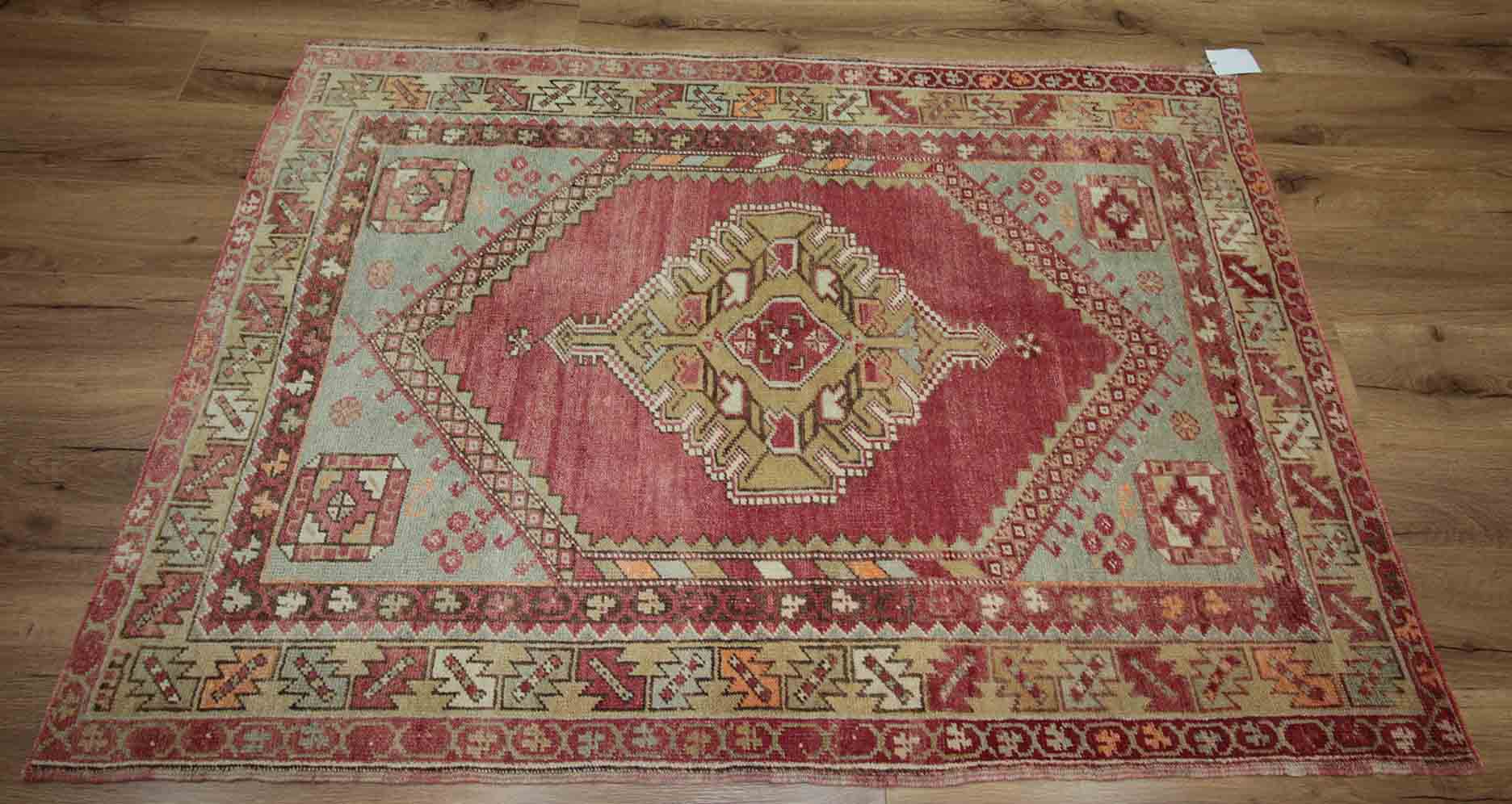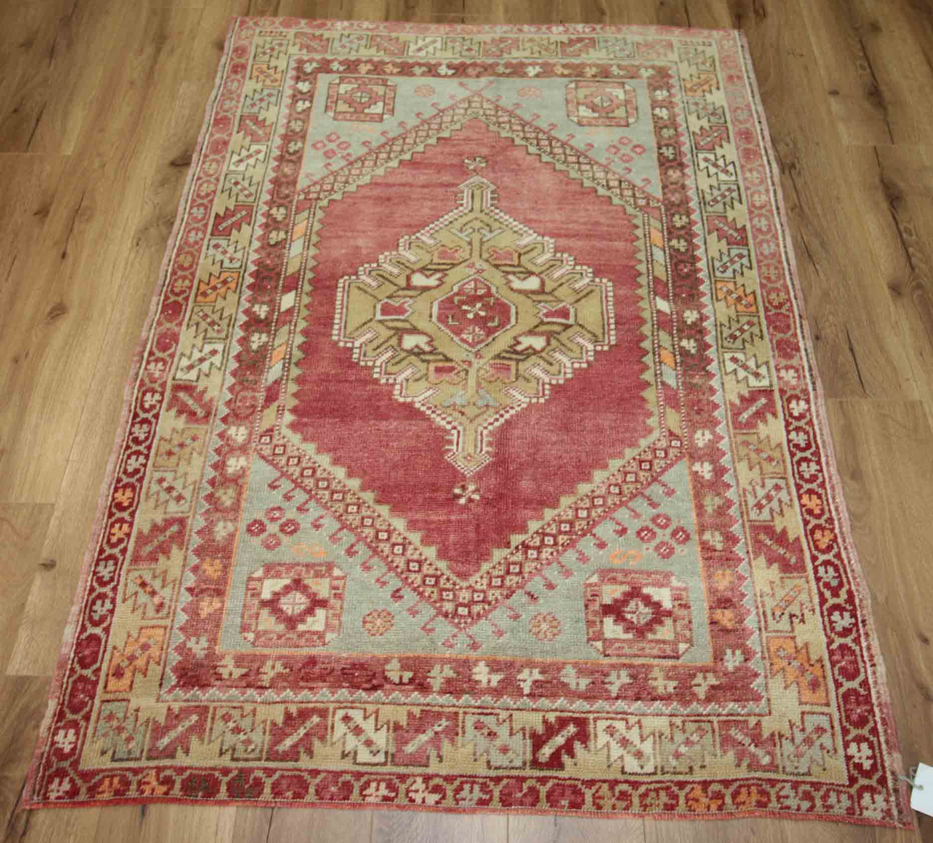 A Beautiful Genuine Turkey Anatolian rug is Hand Knotted by skillful weavers in Turkey with 100% Wool Material. This rug is in Very Good condition. dimensions are 3' 9'' X 5' 2'' in foot and 94 X 153 in centimeter. the primary color is Red.