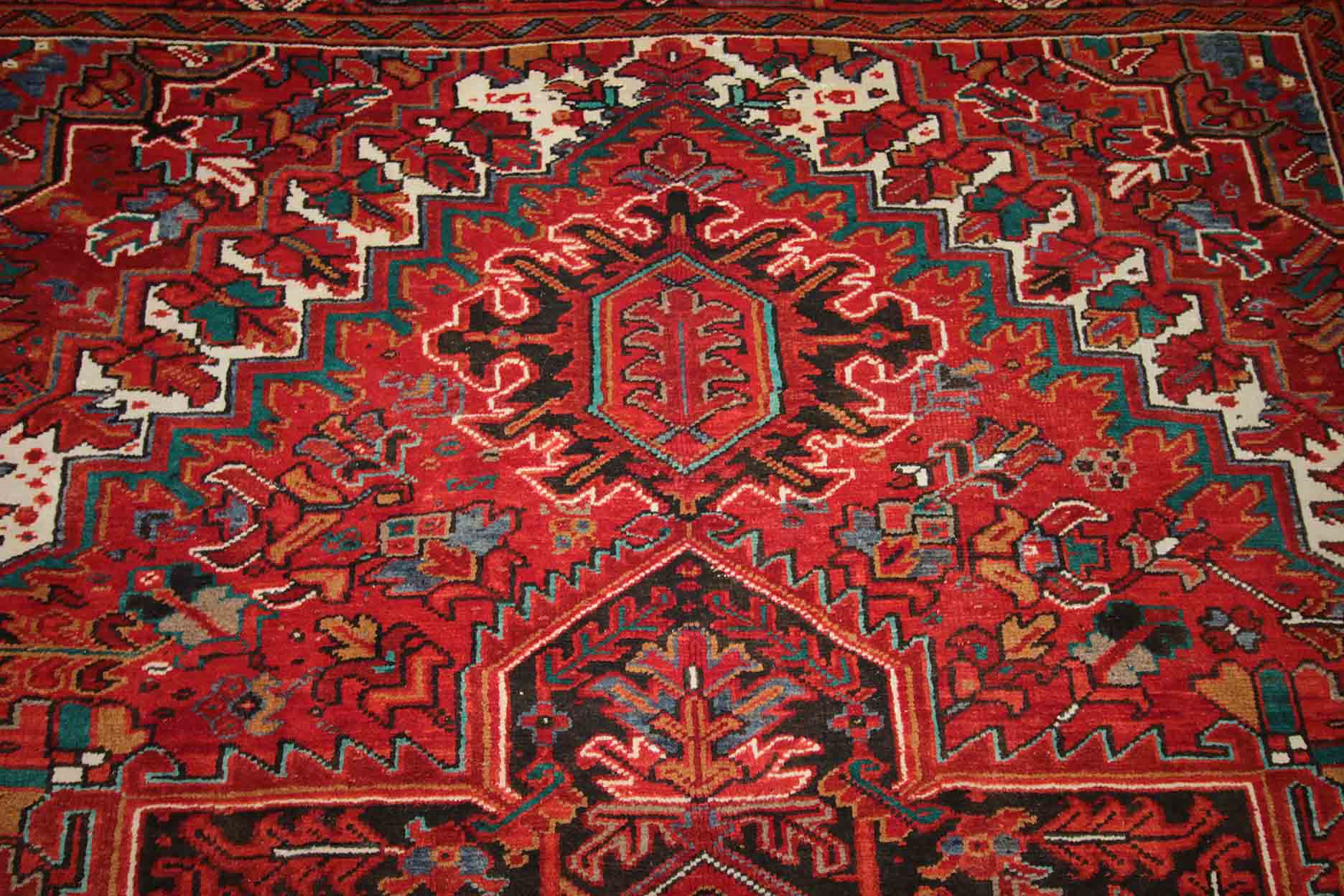 A Beautiful Genuine Iran ( Persia ) Heriz rug is Hand Knotted by skillful weavers in Iran ( Persia ) with 100% Wool Material. This rug is in Very Good condition. dimensions are 8' 0'' X 10' 10'' in foot and 244 X 308 in centimeter. the primary color is Oranges & Rust.